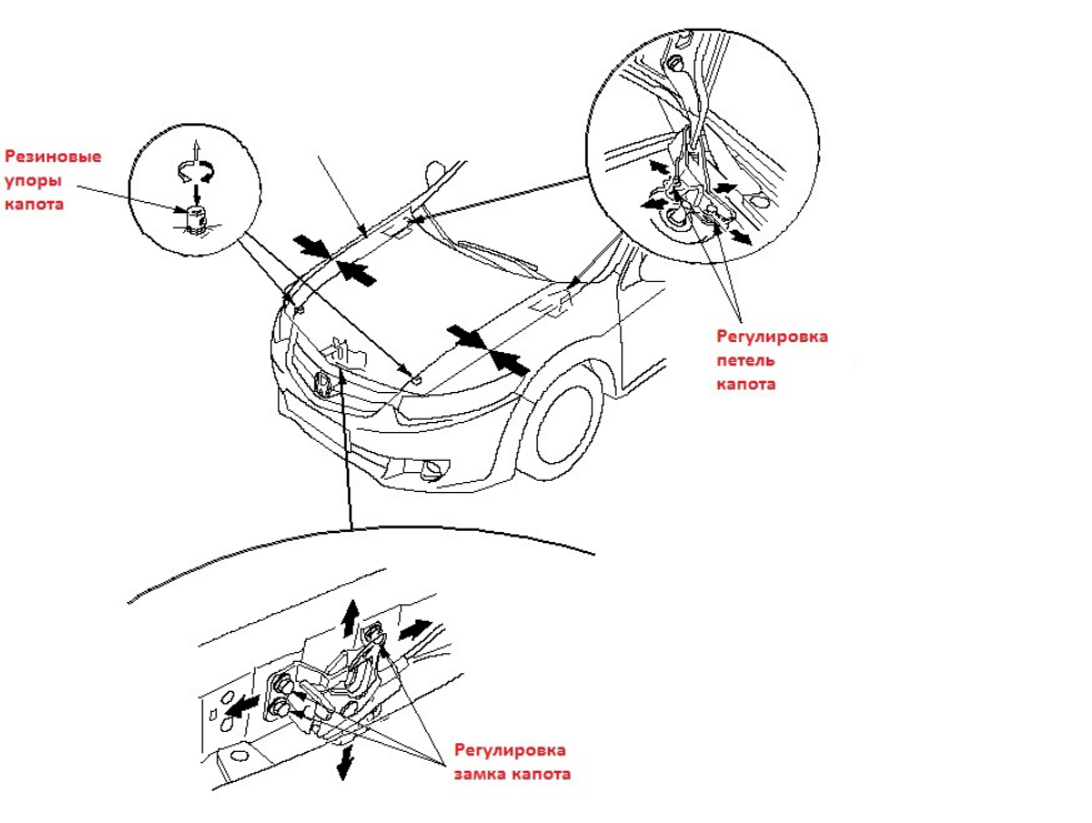 откручиваем по два винта на каждой из петлей капота и снимаем заводской капот, затем прикручиваем новый капот, при этом при затяжке болтов его нужно с обоих сторон поджимать вперед. для этого вам вполне определенно понадобиться помощник со второй парой рук. после установки нового капота, при необхоидмости нужно произвести регулировку зазоров капота. чтобы выставить боковые зазоры, нужно использовать регулировку петель капота, а для этого необходимо будет снять обе пластиковые накладки крыльев, чтобы добраться до нужных болтов. также может потребоваться регулировка замка капота по высоте и резиновых упоров капота. все эти регулировки пОК@заны на рисунке ниже: